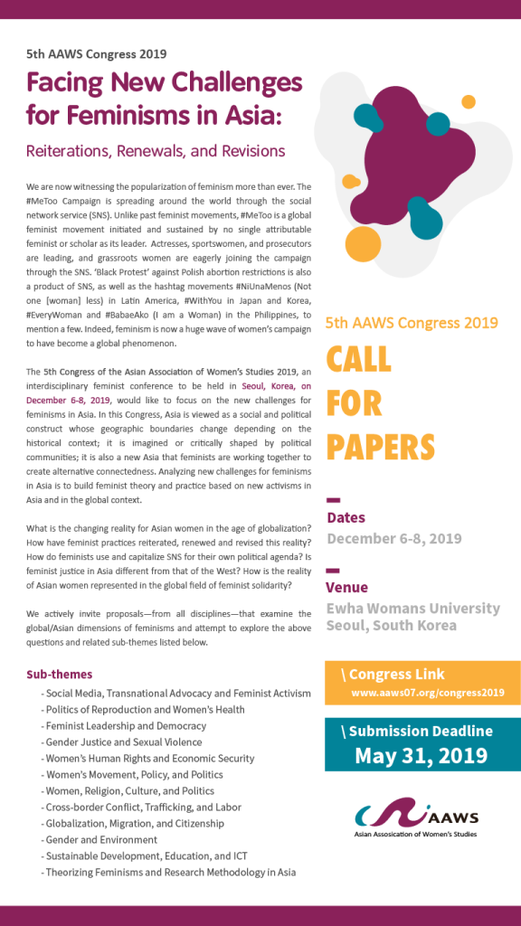 The 5th Congress of AAWS 2019 ‘Facing New Challenges for Feminisms in Asia: Reiterations, Renewals, and Revisions’
